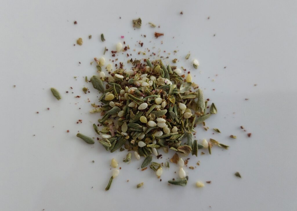 Za’atar is een veelzijdige, aromatische kruidenmelange uit het Midden-Oosten. Za’atar bevat sesamzaad, sumak, tijm en majoraan.