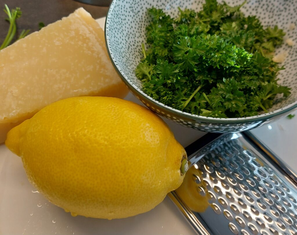 - Meng in een kom de olijfolie, knoflook, peterselie, citroenrasp en de geraspte Grano Padano door elkaar. Smullen maar!