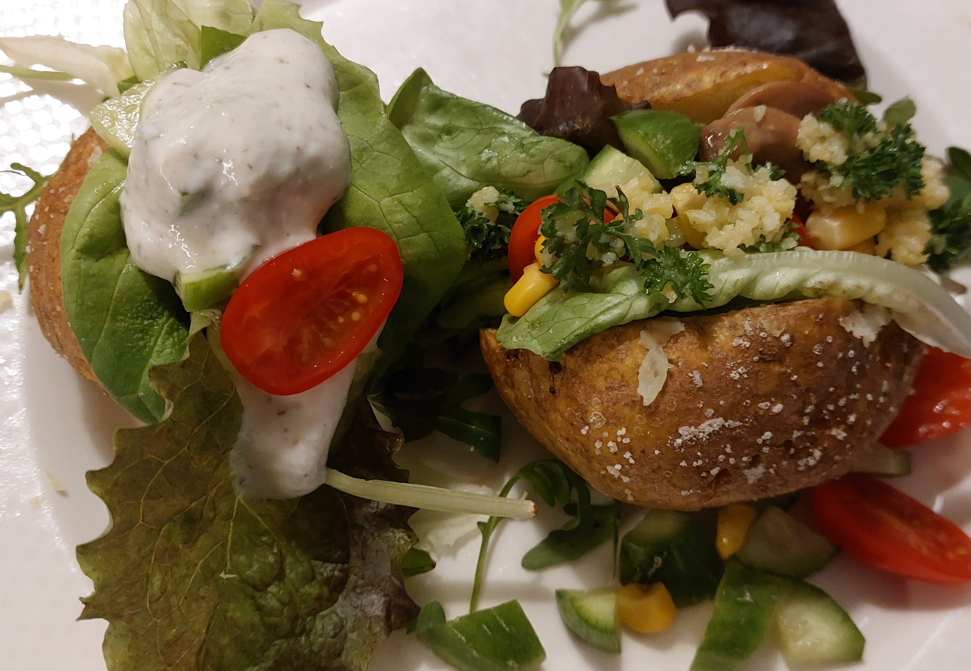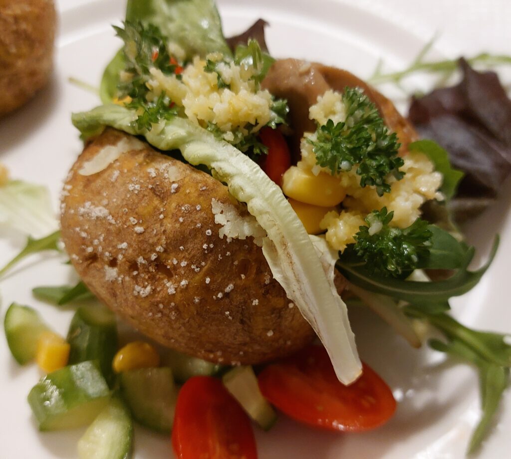 Onze favoriet, eigenlijk zijn het er twee, zijn de Jacket Potato met Gremolata én de Jacket Potato met Tzatziki.