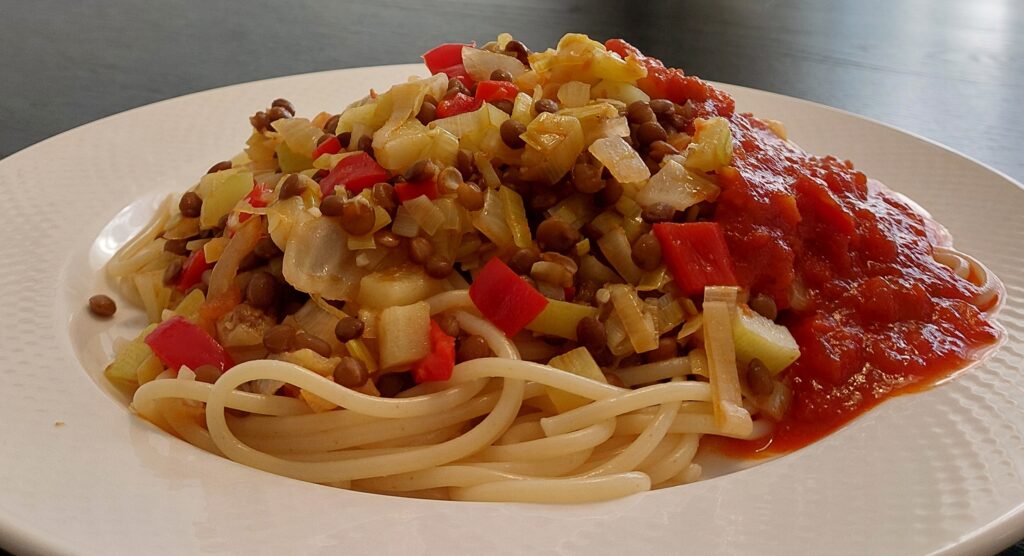 Witte pasta?! Die staat toch op de rode lijst van “snelle” koolhydraten? Maar toch hadden we zin in witte pasta en gingen de keuken in. Het resultaat, spaghetti met linzen en lekker veel groenten. Door de combinatie met eiwitrijke peulvruchten, in dit geval linzen, kun je de opname vertragen en stijgt de bloedsuiker minder snel. Kies wel voor een traditionele variant en niet voor vlugkokend. De linzen dienen tevens als vleesvervanger.